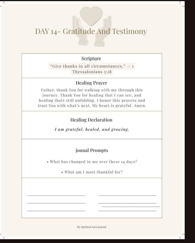 My spiritual Aura Journal - A 14 Day Healing Journal with God. This guided prayer journal was created for those seeking emotional and spiritual healing through scripture, prayer, and reflection. Each day gently invites you to release pain, restore peace, and reconnect with Gods presence.